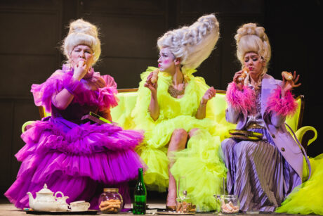 Zleva Jana Hejret Vojtková (Tereza de Lamballe), Karolína Baranová (Marie Antoinetta) a Eliška Jansová (Jolanda de Polignac) v inscenaci Marie Antoinetta libereckého Divadla F. X. Šaldy. Foto: Tereza Jiroušková